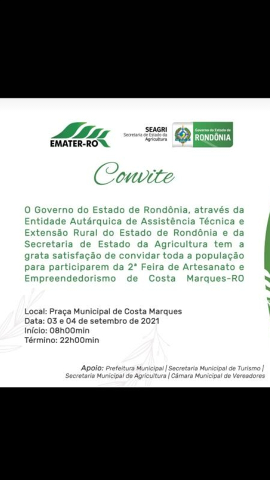 Secretária do Estado de Agricultura tem a honra de convidar a população para participar da 2º Feira Artesanato e Empreendedorismo no município de Costa Marques, com a presença e apoio das Autoridades, que será realizado nos dias 03 e 04 de setembro de 2021; Local na Praça Municipal de Costa Marques/RO.