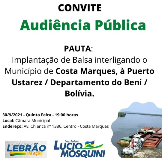 TEMA: Implantação de Balsa interligando o Município de Costa Marques, á Puerto Ustarez / Departamento do Beni / Bolívia, no dia 30 de setembro de 2021, as 19:00 horas, no Plenário da Câmara Municipal de Costa Marques.